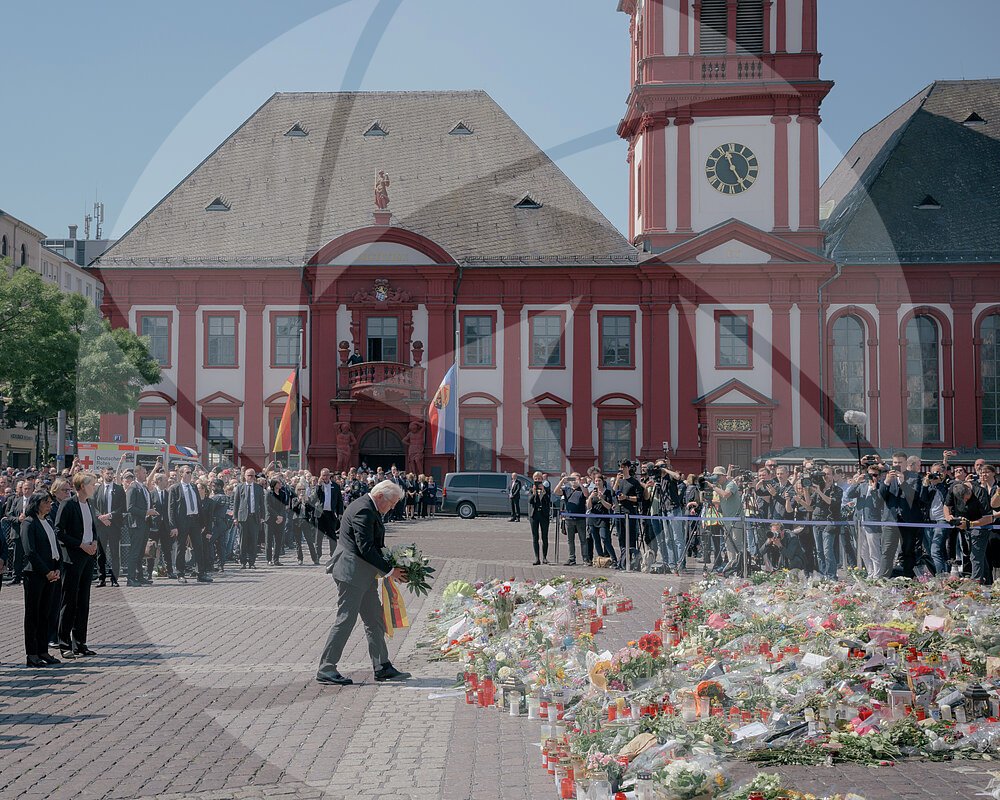 Bundespräsident Frank-Walter Steinmeier legt einen Blumenkranz zum Gedenken an den getöteten Polizisten Rouven L. auf dem Marktplatz in Mannheim nieder, 7. Juni 2024.