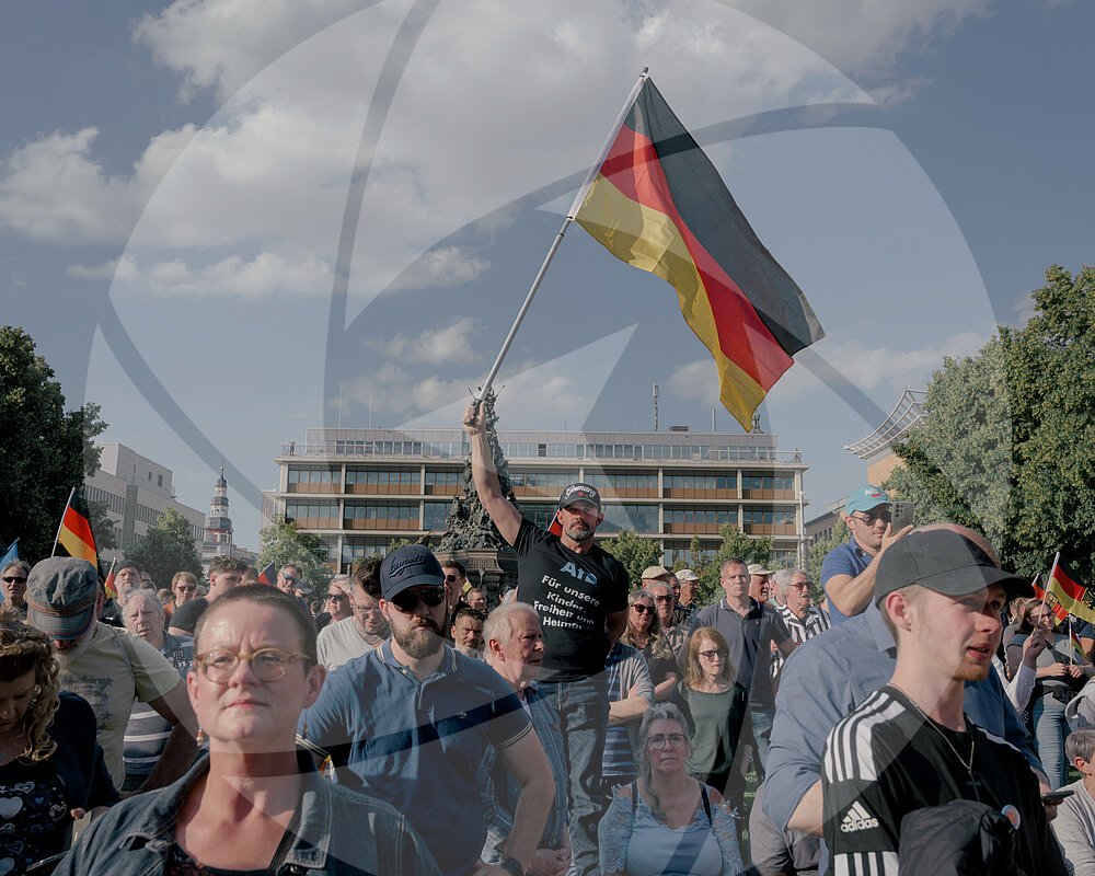 Ein jugendlicher AfD-Unterstützer schaut über einen Sichtschutz (eine circa 30 Meter Lange Deutschlandfahne) auf die Gegendemonstration, auf der AfD-Kundgebung auf dem... MEHR
