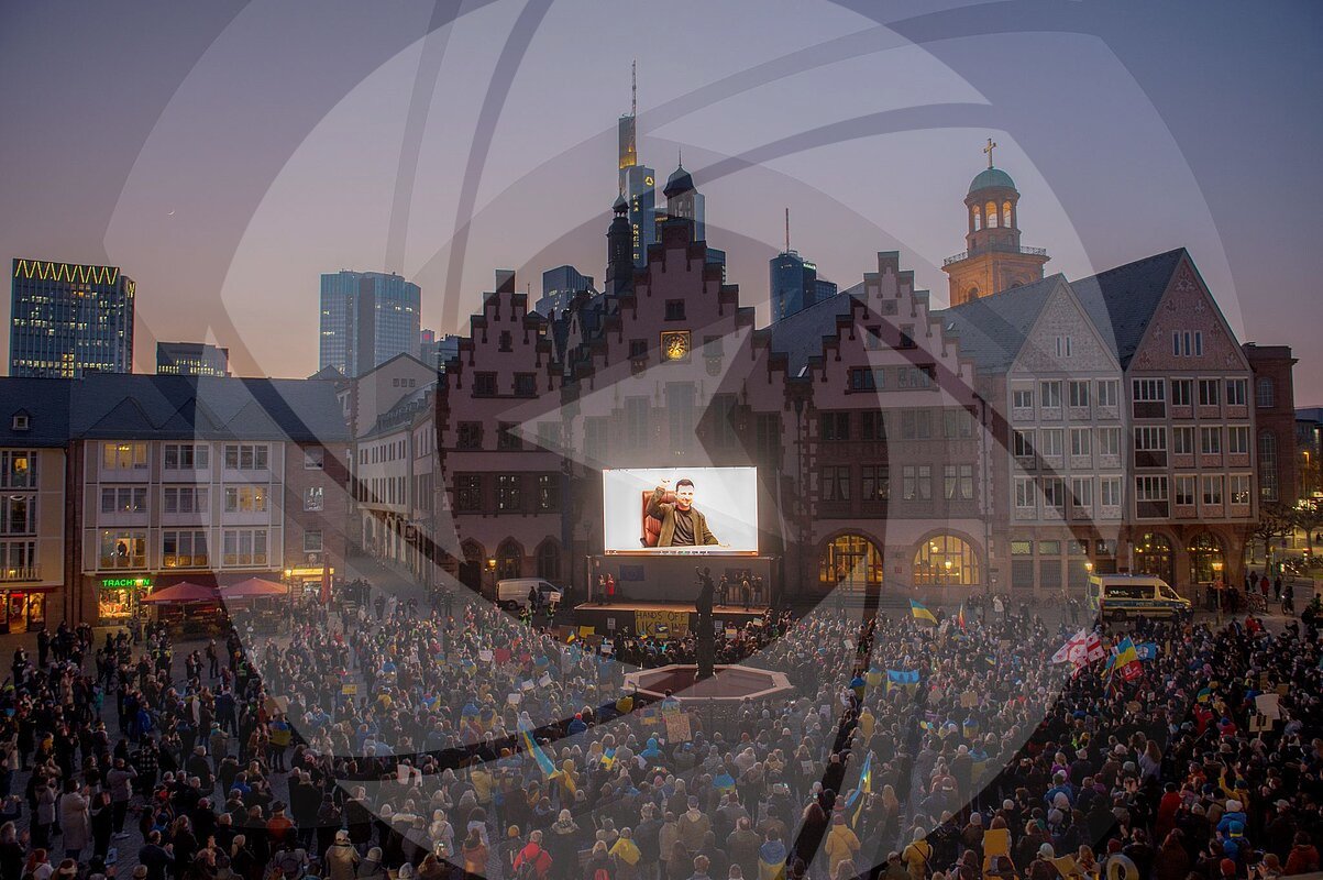 Mehrere tausend Menschen nehmen auf dem Römerberg in Frankfurt an einer Solidaritätskundgebung für die Ukraine teil. Dabei ist der ukrainische Präsident Wolodymyr Selenskyj live... MEHR