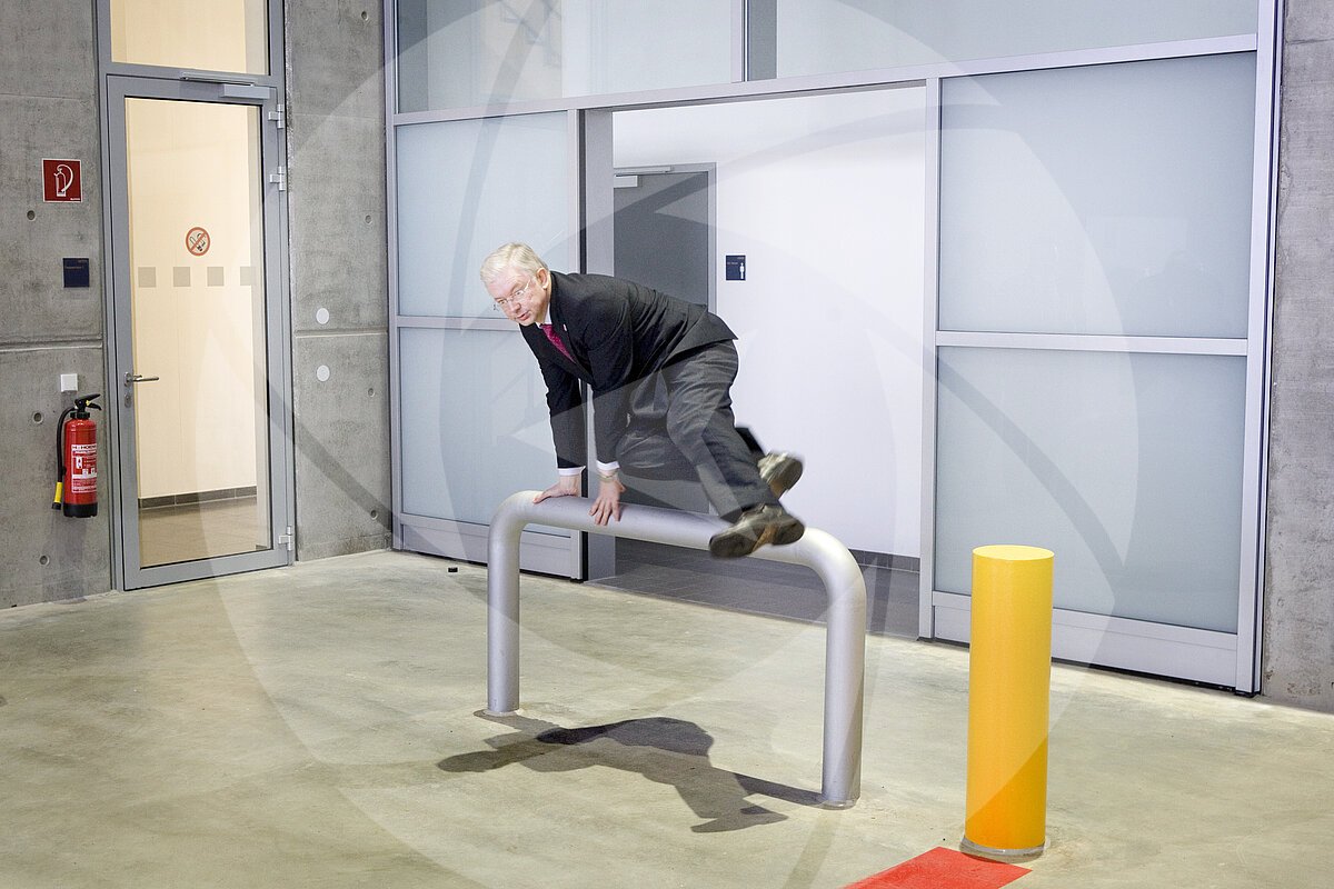 Der Hessische Ministerpräsident Roland Koch überspringt während der Einweihungsfeier der A-380 Halle mit einer Hockwende ein Hindernis vor der öffentlichen Toilette.