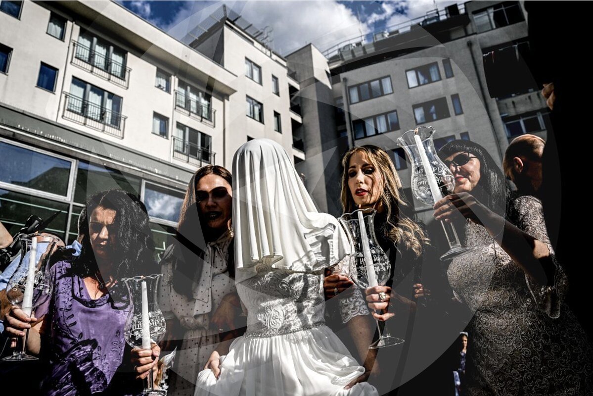 Braut Elisheva Chay (mitte), Flüchtling aus Odessa, wird von ihren Verwandten während der jüdischen Trauung begleitet