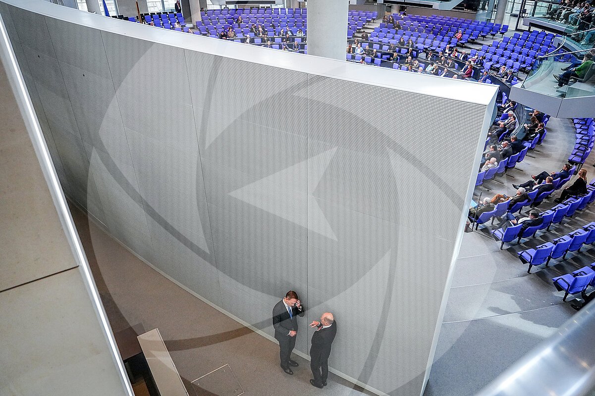 Christian Lindner (FDP), Bundesminister der Finanzen, und Bundeskanzler Olaf Scholz (r, SPD) unterhalten sich nach der Regierungserklärung von Kanzler Scholz hinter dem Plenum.