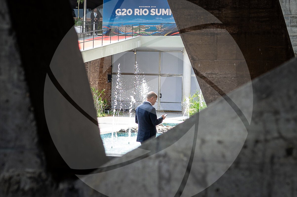 Bundeskanzler Olaf Scholz am Mobiltelefon nach Ende des G20-Gipfels in Rio.