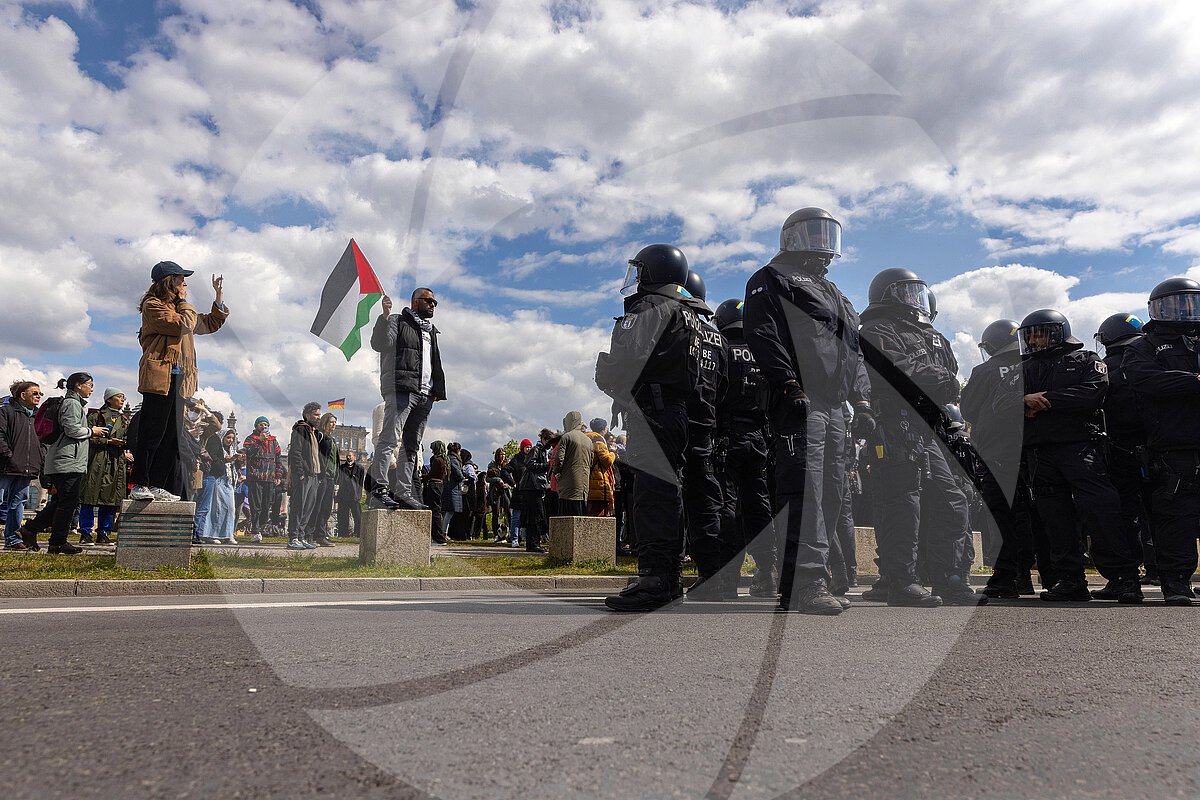Ein Demonstrant schwenkt eine palästinensische Flagge während einer pro-palästinensischen Demonstration in der Nähe des Reichstagsgebäudes. Die Polizei hat die Demonstration aufgelöst.