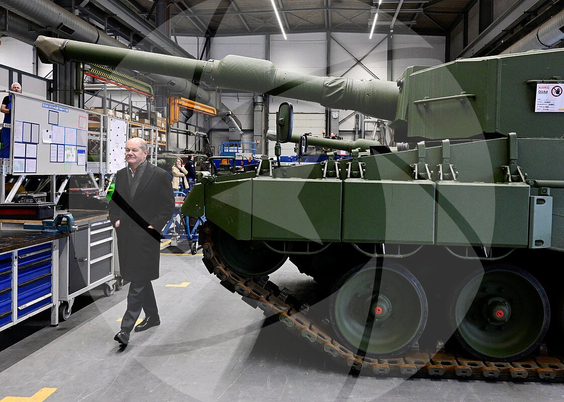 German Chancellor Olaf Scholz visits a production line at the future site of an arms factory where weapons maker Rheinmetall plans to produce artilleries from 2025, in Unterluess, Germany