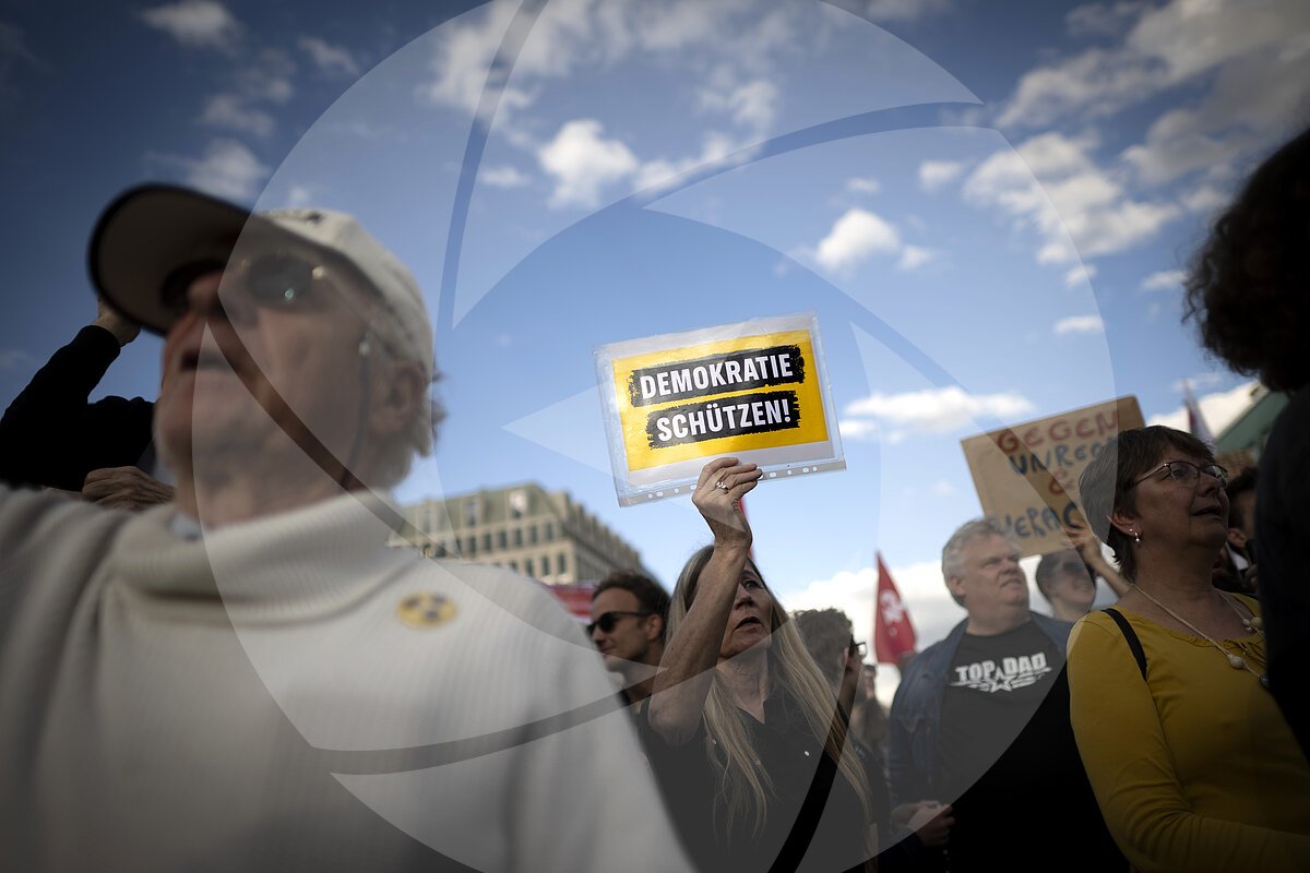 Demonstranten vom Bündnis #TogetherAgainstRights mit Schild Demokratie Schützen auf der Demo unter dem Motto Zusammen Gegen Rechts und für ein Verbot der AfD in Berlin
