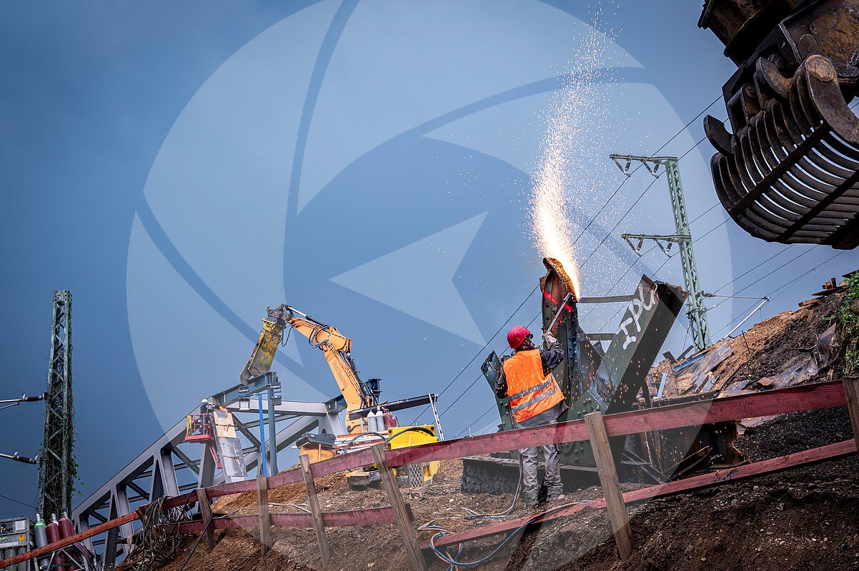 Neue Brücken für Köln. Arbeiter zerlegen eine 1912 erbaute Eisenbahnbrücke durch autogenes Brennschneiden.