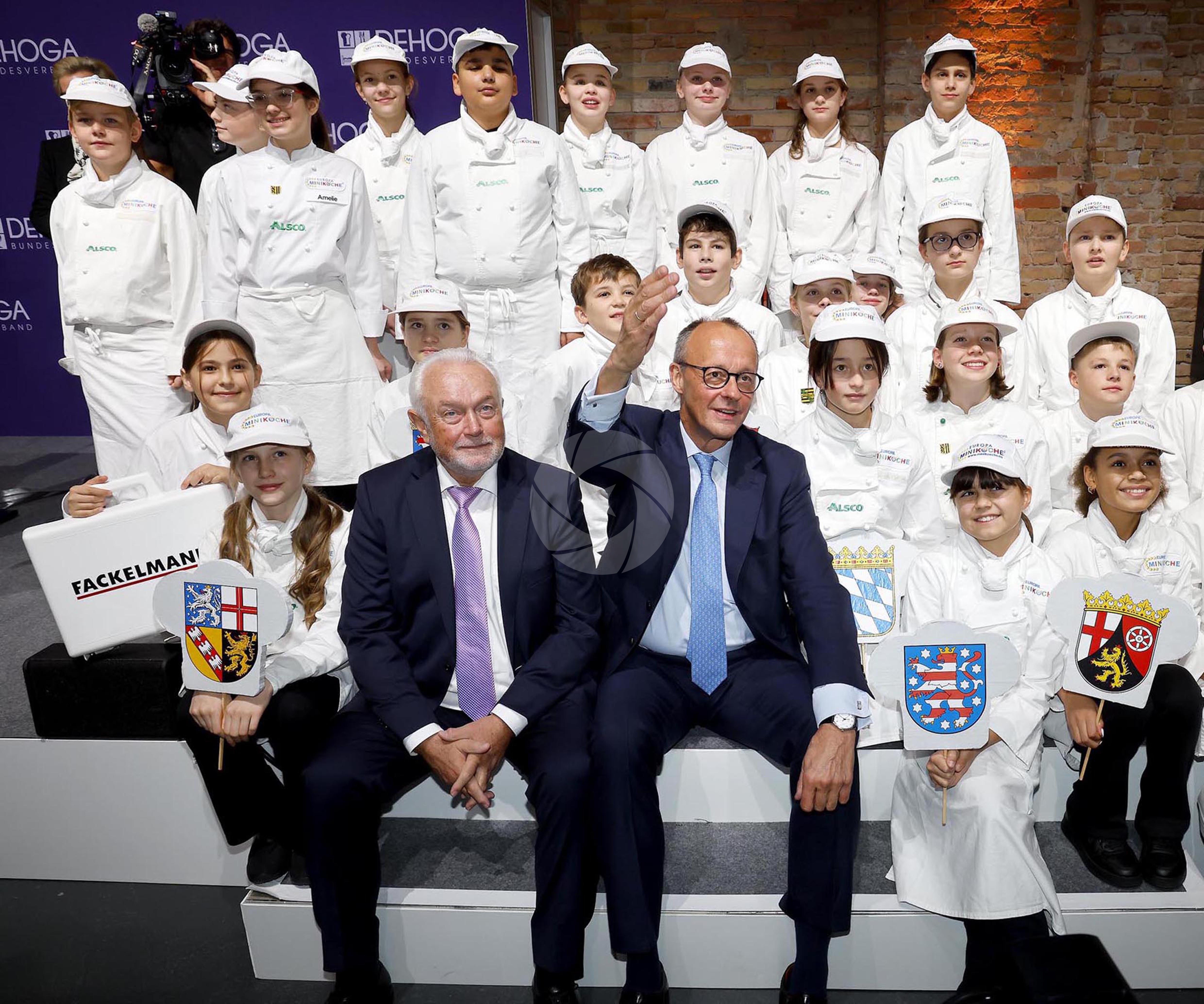 Wolfgang Kubicki MdB (Stellvertretender FDP-Vizevorsitzender, und Friedrich Merz MdB (Vorsitzender der CDU Deutschlands mit den Kinder-Botschaftern des Projektes Europas Miniköche