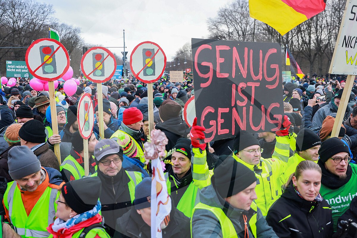 A person holds a banner that reads 'enough is enough', as German farmers protest against the cut of vehicle tax subsidies of the so-called German Ampel coalition government in... MEHR