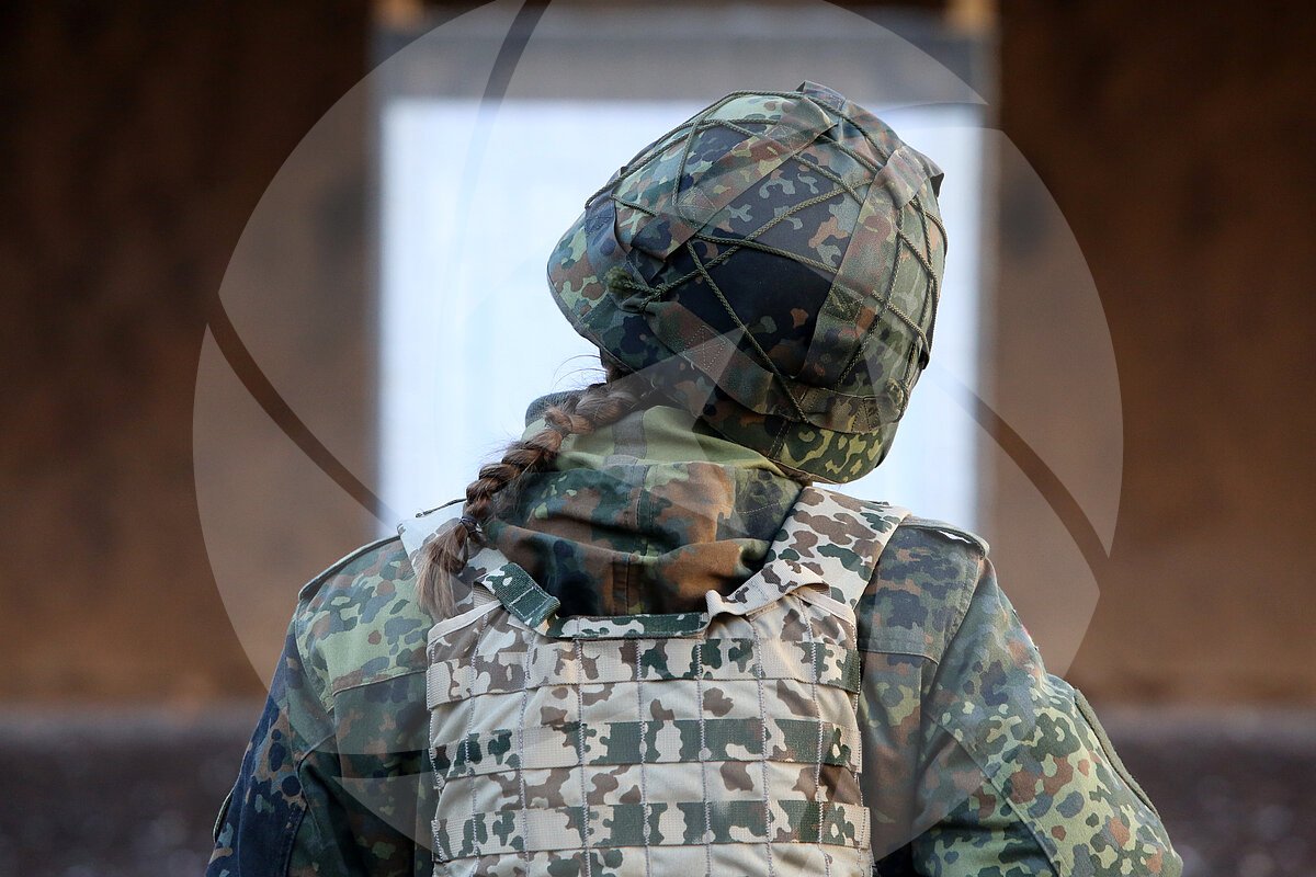 Eine Soldatin der freiwilligen Reservisten blickt während einer Pistolenübung in der Nähe der Clausewitz-Kaserne auf ein Ziel. Angesichts der zunehmenden Bedrohung durch einen... MEHR