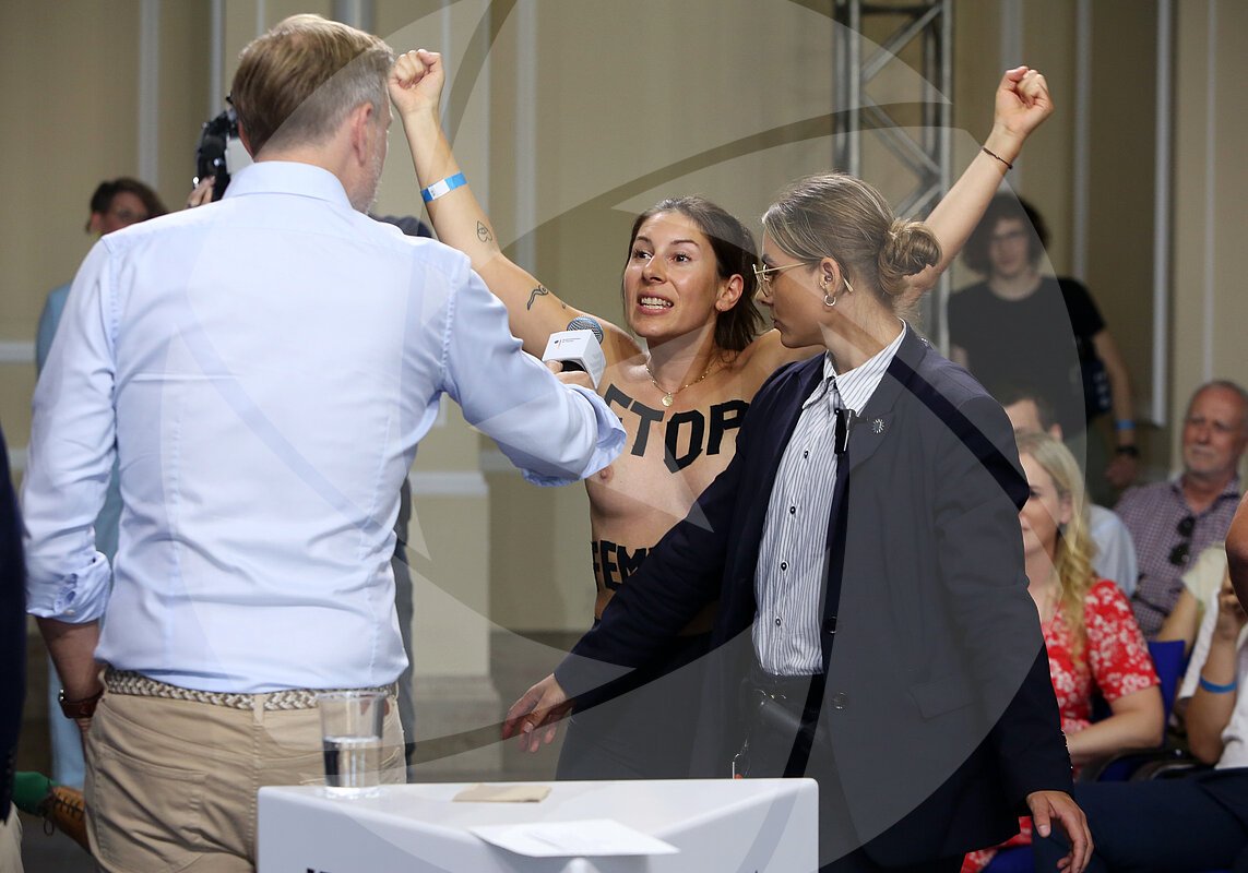 Bundesfinanzminister Christian Lindner (FDP) hält einer von drei Aktivistinnen der feministischen Aktionsgruppe Femen ein Mikrofon hin, als sie die Bühne stürmt und gegen die... MEHR