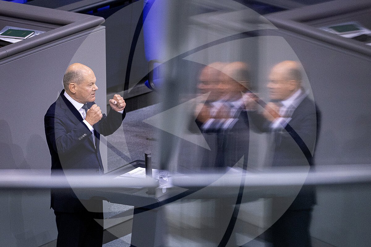 Olaf Scholz, der Bundeskanzler Deutschlands, hält eine Rede vor dem Bundestag zum Haushalt 2025.