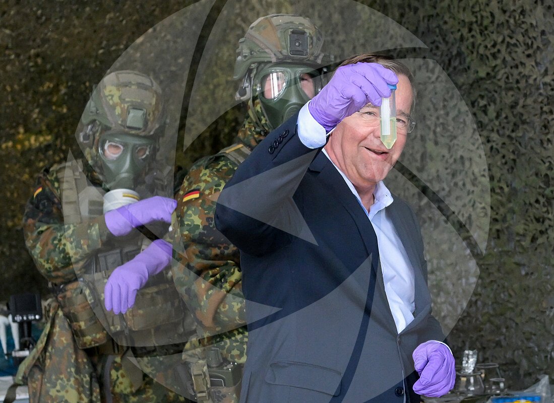 German Defence Minister Boris Pistorius holds a sample tube during his visit to Bundeswehr CBRN Defence Command in Bruchsal, Germany