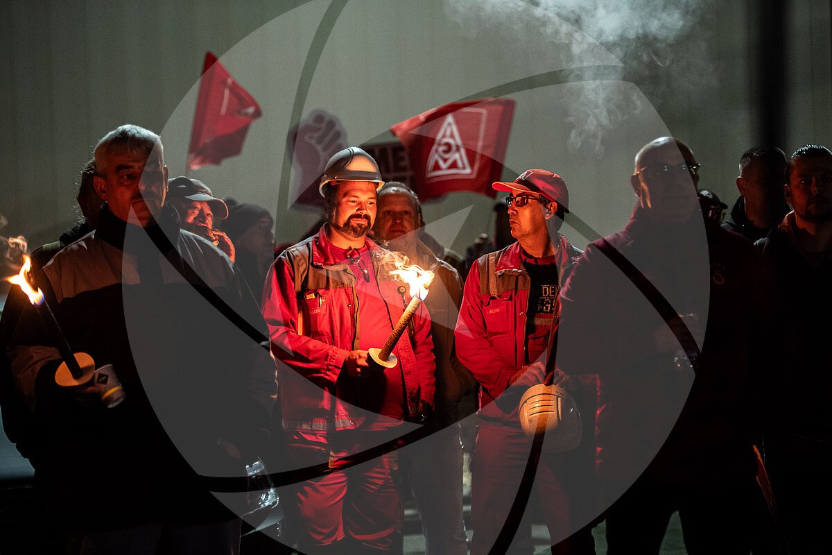 Workers from a Speira aluminum processing plant take part in a protest with torches during a short-term strike on October 31, 2024 in Grevenbroich, Germany. IG Metall, the labor... MEHR