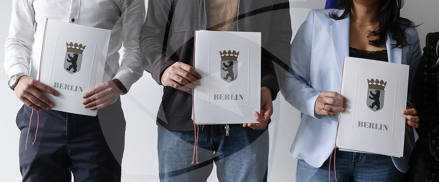 Menschen aus dem Libanon, Syrien und Nicaragua zeigen ihre Einbürgerungsurkunden nach einer Einbürgerungsfeier bei der Einbürgerungsstelle des Landesamtes für Einwanderung, LEA, in Berlin.
