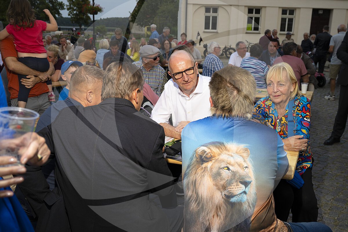 Brandenburgs Ministerpräsident Dietmar Woidke im Gespräch mit Besucher:innen einer Wahlkampfveranstaltung der Brandenburger SPD auf dem Marktplatz in Lindow.