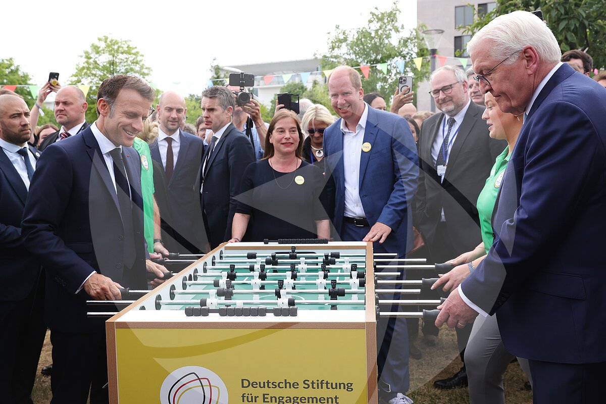 Bundespräsident Frank-Walter Steinmeier spielt Kicker mit dem Französischen Staatspresidenten Emmanuel Macron
