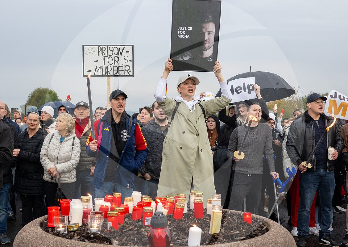 Menschen demonstrieren vor dem Haupttor der US-Air Base Spangdahlem. Ein wegen Tötung angeklagter Armeeangehöriger wurde trotz Geständnisses vom dortigen Militärgericht frei gesprochen.