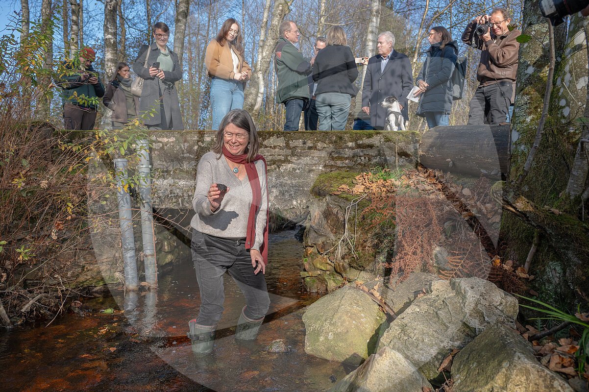 Die ehemalige rheinland-pfälzische Umweltministerin Ulrike Höfgen (Bündnis 90/Die Grünen) hält im Thranenbach (Nationalpark Hunsrück-Hochwald) stehend einen Stein mit der kürzlich... MEHR