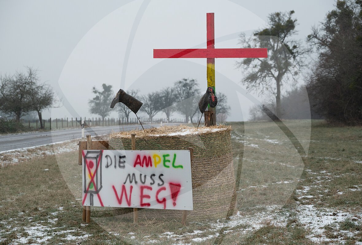 „Die Ampel muss weg“ steht vor einem Holzkreuz auf einer Wiese bei Trier. Ein Landwirt hat mit dieser Installation seinen Protest gegen die Regierung ausgedrückt.