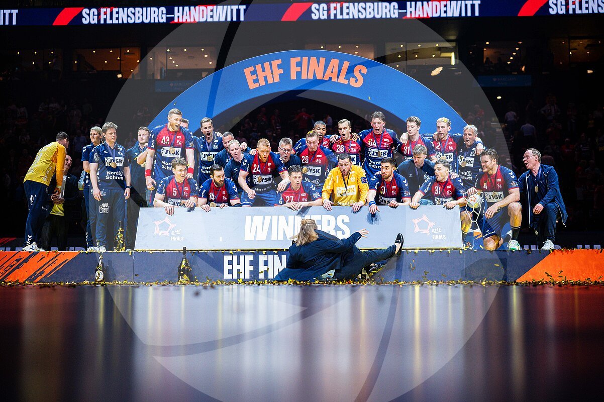 Vor dem Gewinnerfoto bei der Siegerehrung der Flensburger Mannschaft nach dem Sieg in der EHF European League gegen Füchse Berlin rutscht eine Mitarbeiterin durch Sekt und... MEHR