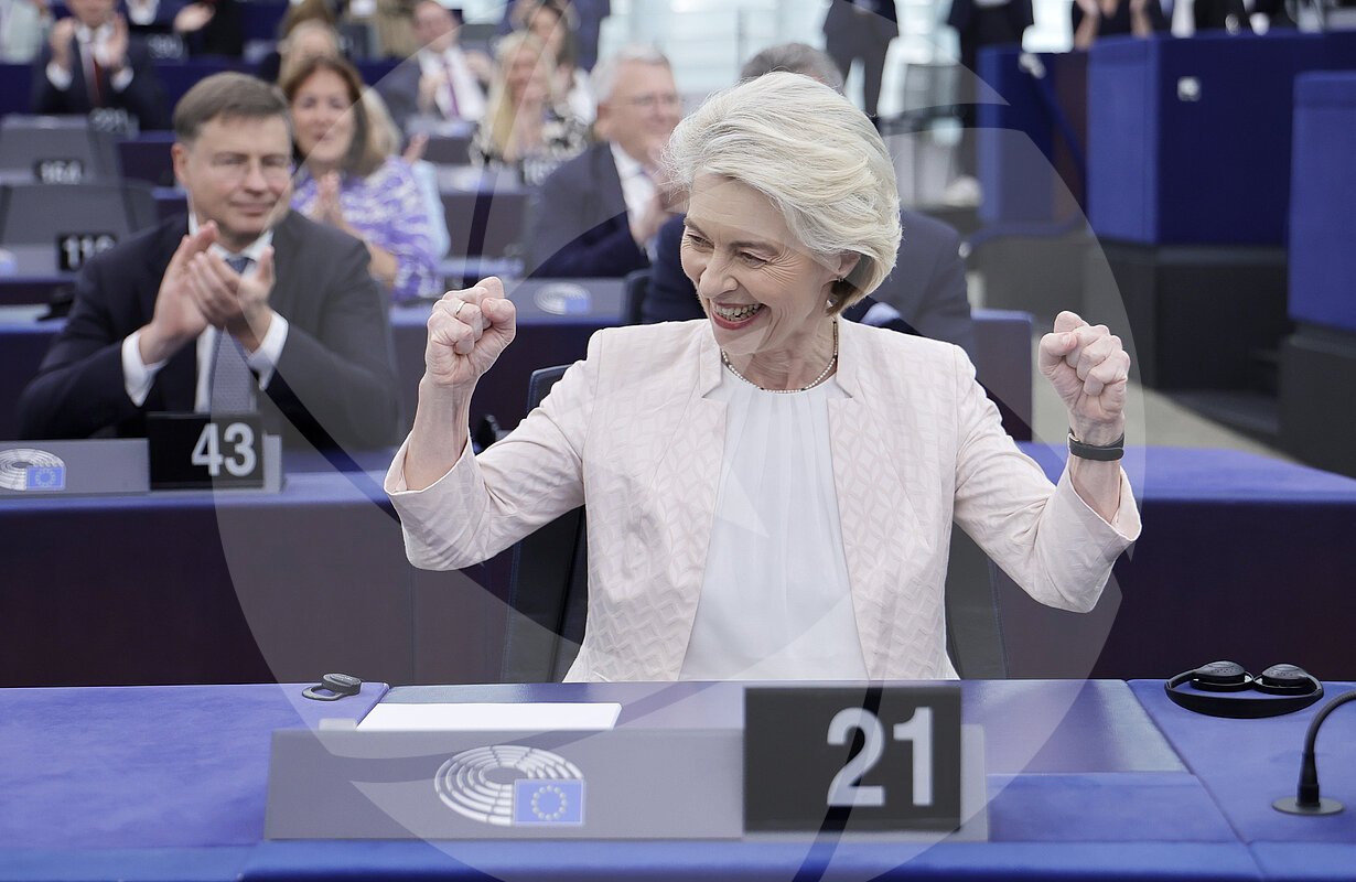 Ursula von der Leyen reagiert auf ihre Wiederwahl zur Präsidentin der Europäischen Kommission während einer Plenarsitzung des Europäischen Parlaments