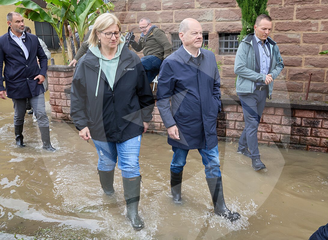 Hochwasser im Saarland Bundeskanzler Olaf Scholz (SPD) geht am Samstag (18.05.2024) zusammmen mit der saarländischen Ministerpräsidentin Anke Rehlinger (SPD) in... MEHR
