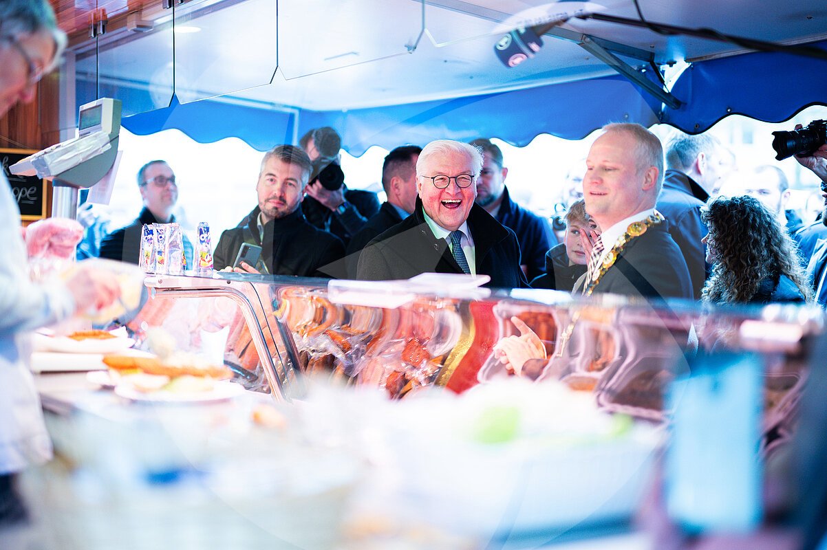 Bundespräsident Frank-Walter Steinmeier bestellt sich ein Fischbrötchen auf dem Markt während der "Ortszeit" - eine Veranstaltungsreihe, bei der er für drei Tage seinen Amtssitz verlegt.