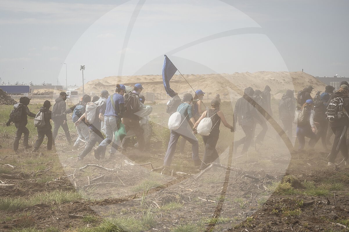 Proteste "Disrupt Tesla" gegen die Tesla Gigafactory und deren Erweiterung in Grünheide. Aktivist:innen versuchen auf das Werksgelände zu gelangen und werden von der Polizei gestoppt.