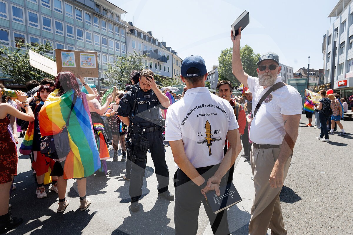Ein Anhänger einer Baptistenbewegung hält den Teilnehmer:innen des CSD Mittelhessen eine Bibel entgegen, während sich ein Polizist dabei an die Stirn fasst.