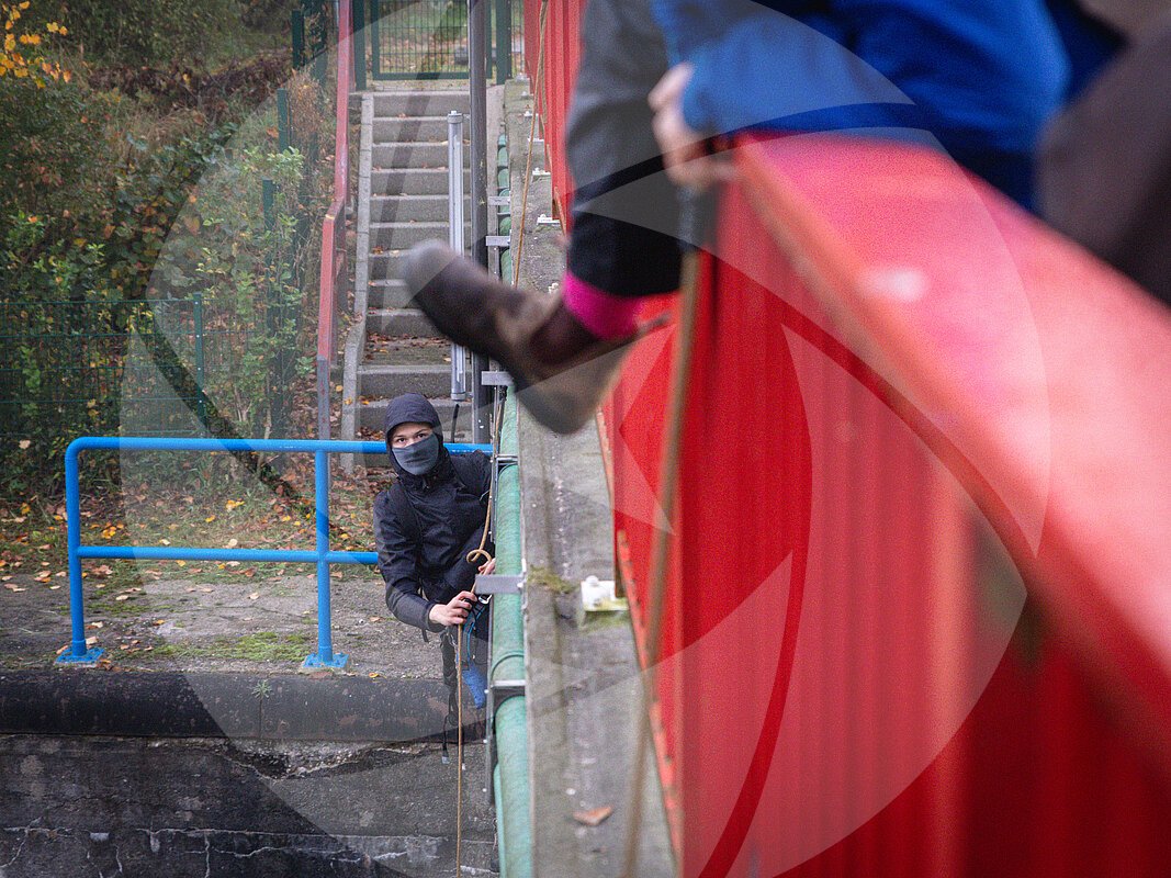 Aktivist*innen blockieren eine Schleuse des Wesel-Datteln-Kanals. Am frühen Morgen seilen sich die Aktivist*innen vor die Schleusenkammern ab. Sie wollen damit gegen den Import... MEHR