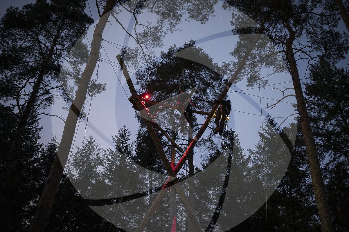 Aktivist:Innen haben den Wald vor Tesla in Grünheide besetzt, der als Erweiterungsfläche für das Werk vorgesehen ist. In der Nacht bauen sie an Baumhäusern und einem Tripod.