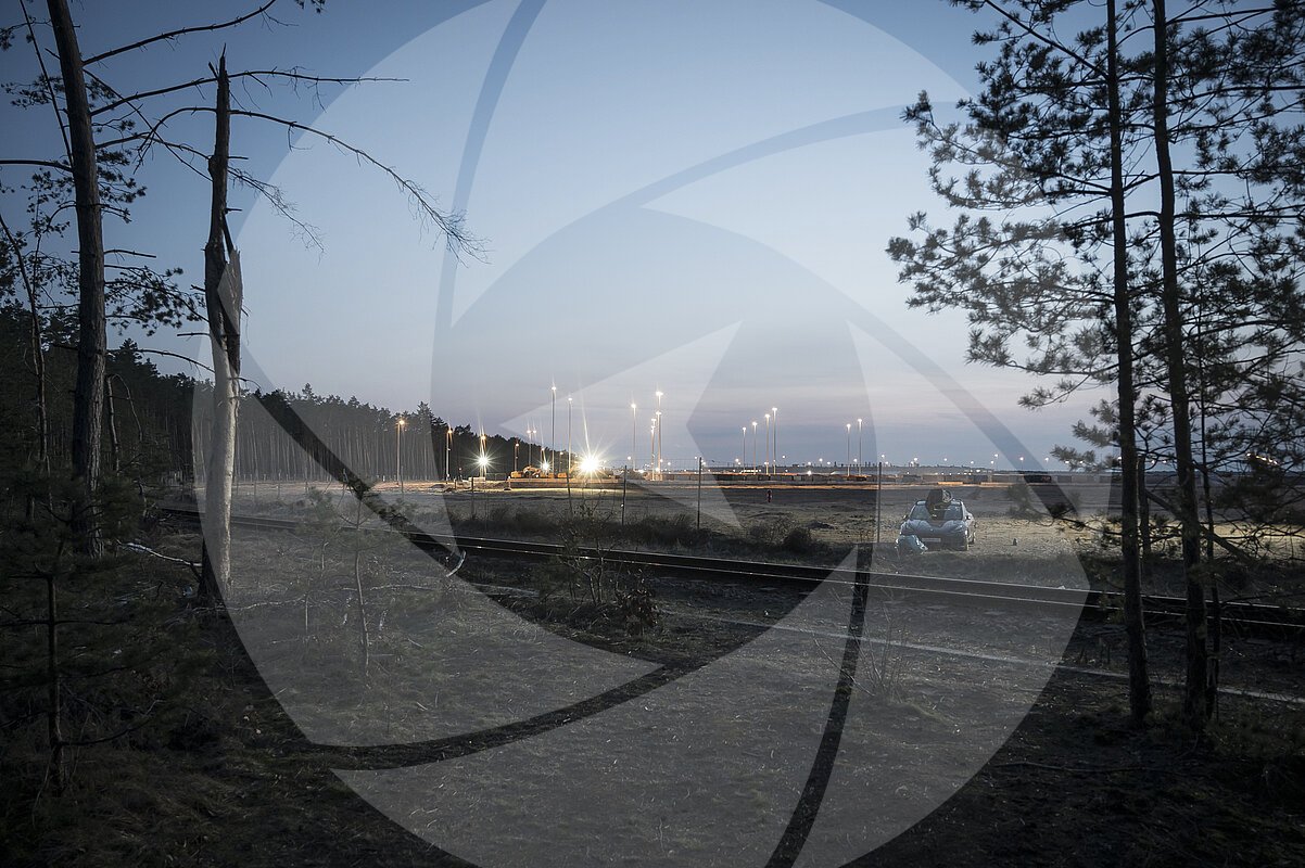 Blick auf das Tesla-Gelände der Giga-Factory in Grünheide bei Berlin. Aktivist:Innen haben den Wald vor Tesla in Grünheide besetzt, der als Erweiterungsfläche für das Werk... MEHR
