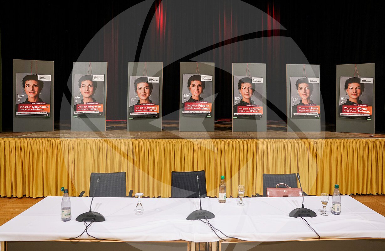 Plakate mit dem Foto von Wagenknecht hängen nach der Präsentation der Kampagne für die Landtagswahl des Bündnis Sahra Wagenknecht - Vernunft und Gerechtigkeit (BSW). Am 1.... MEHR