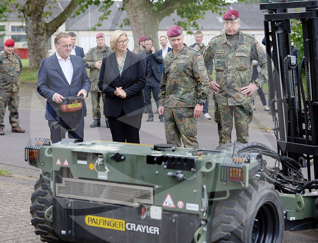 Bundesverteidigungsminister Boris Pistorius (l.) bedient bei seinem Besuch am Dienstag (17.09.2024 ) bei der Saarlandbrigade in Saarlouis einen Ferngesteuerten Gabelstapler... MEHR
