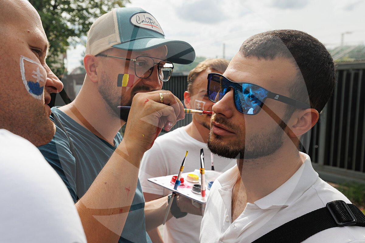 Vor dem ersten EM-Spiel in Frankfurt schminken sich „gegnerische“ Fans gegenseitig.