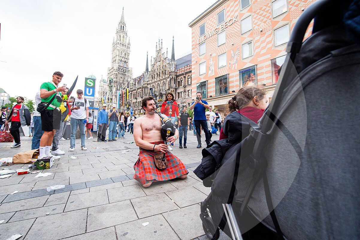 Vor dem Eröffnungsspiel Deutschland gegen Schottland spielt ein Schotte am Marienplatz vor einem Kind im Kinderwagen Dudelsack.