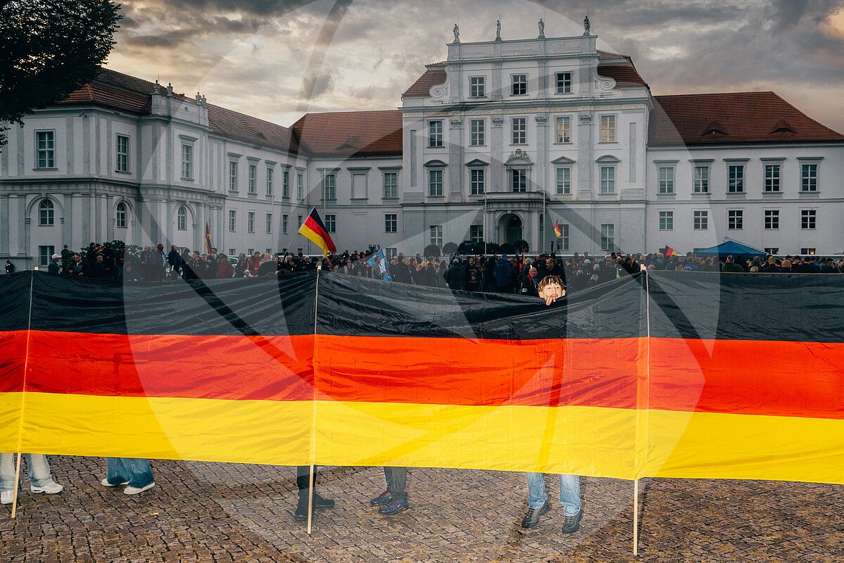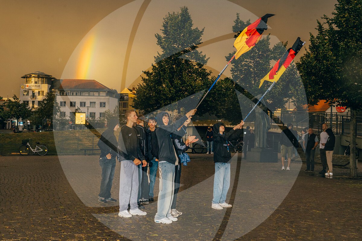 Jugendliche Anhänger*Innen der AfD (die linke Fahne ist eine DDR-Fahne) rufen etwas den Gegendemonstrant*innen zu auf der AfD-Kundgebung auf dem Schlossplatz Oranienburg am 11. September 2024.