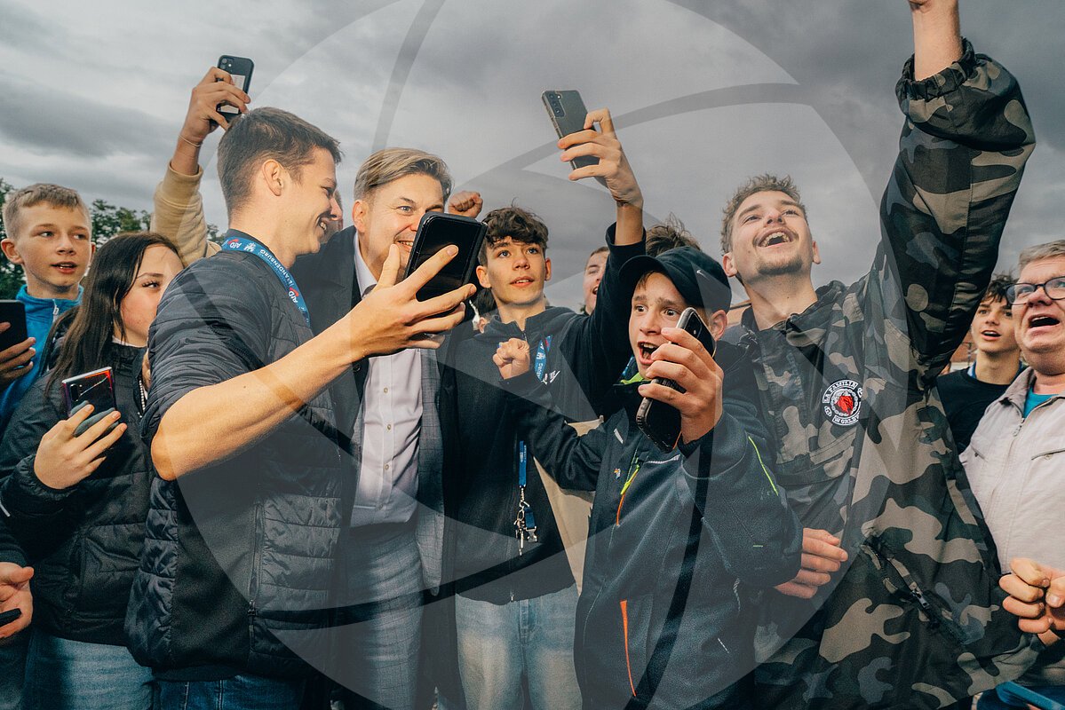 Jugendliche Anhänger*Innen machen Selfies mit AfD Europapolitiker Maximilian Krah auf der AfD-Kundgebung auf dem Schlossplatz Oranienburg am 11. September 2024.