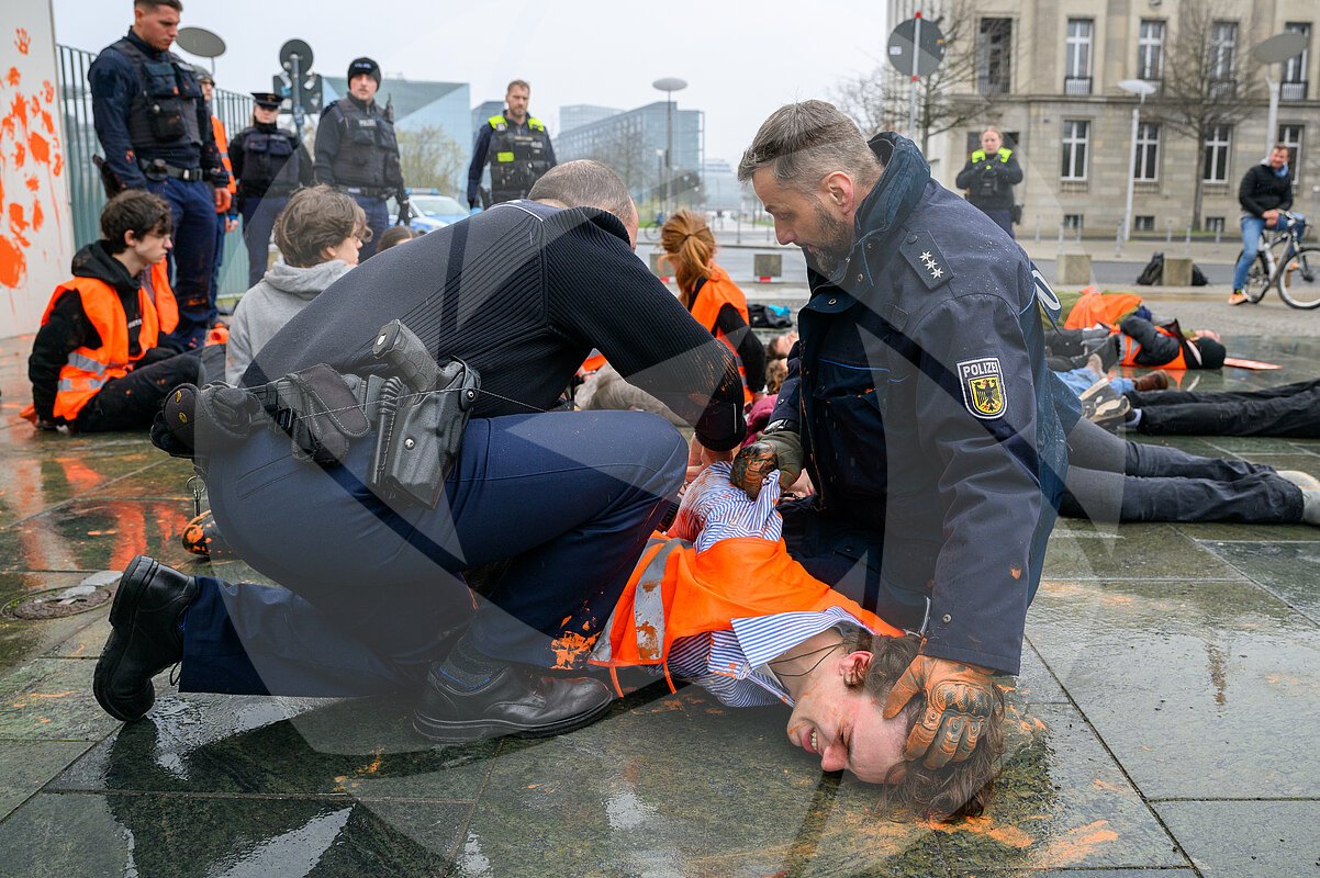 Polizei fesselt Aktivisten der Letzten Generation nach Farbattacke auf das Bundeskanzleramt mit Handschellen.